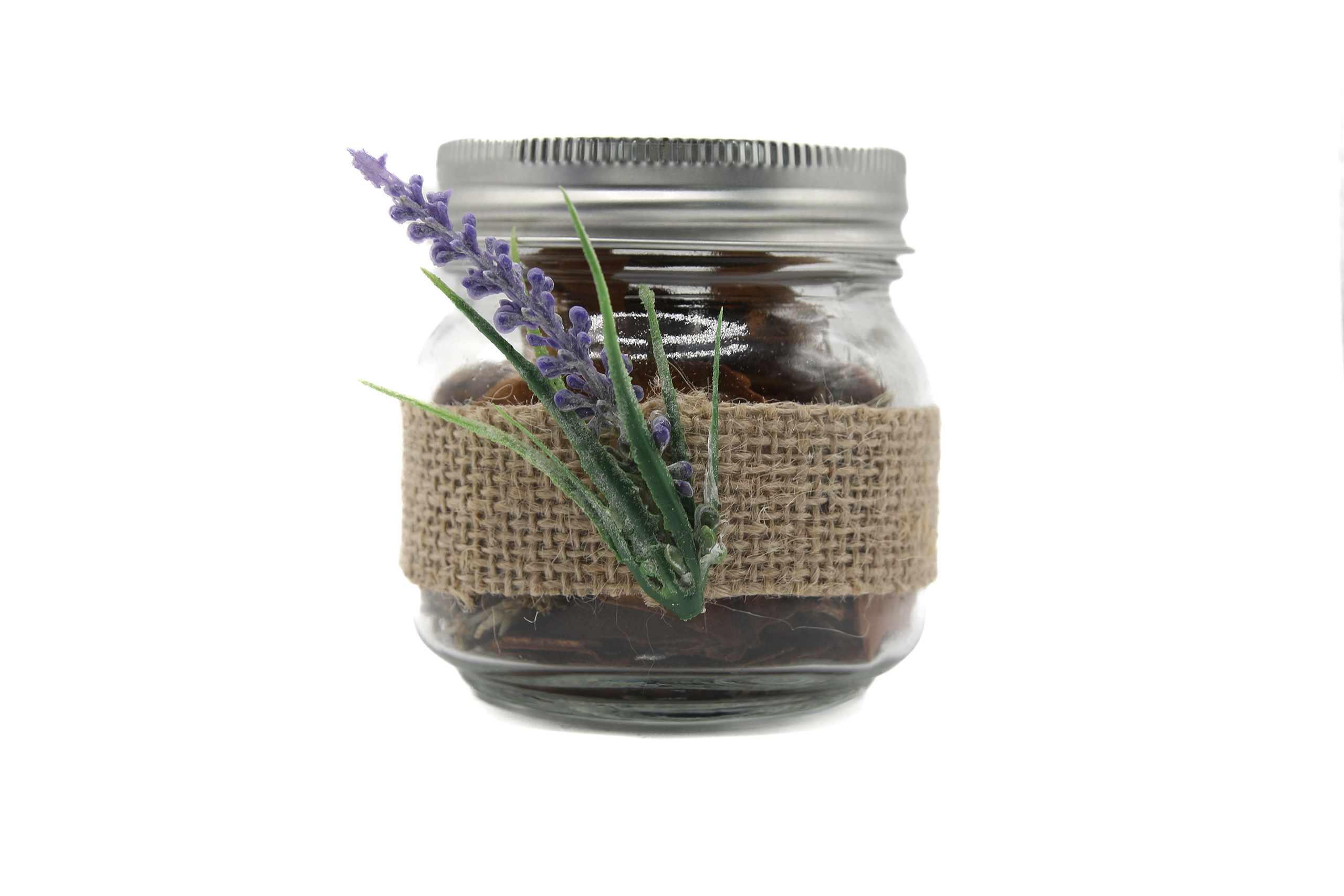 Lavande, orange déshydraté, pétales de rose, écorce de bois, huile essentielle lavande et tangerine.